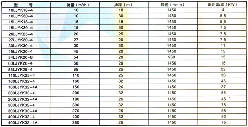 性能范圍 流量Q=10~400 m3/h 揚程H=50m。
